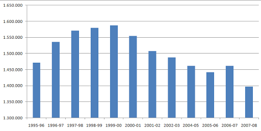 Evolución gráfica desde 1995 hasta el 2007-08 (falta 2003-2004). Se observa un repunte en el 2006-07 pero la caída vuelve al año siguiente ( y en 2006 apenas se sabía si había Bolonia o no)