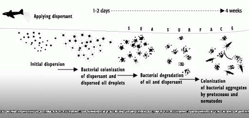 De esta forma, alteran la estructura del petróleo, lo fractura y le hace hundirse en las profundidades marinas. La mancha de petróleo desaparece de la superficie, con lo que se evita que se vean afectados las aves y los mamíferos marinos, y también que la mancha contamine la costa.