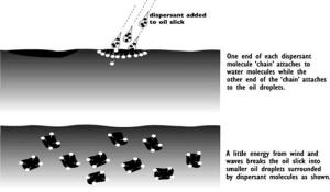 Los dispersantes contienen moléculas con una parte hidrofílica (afinidad por el agua) y otro extremo con afinidad por el petróleo (hidrofóbica). Dichas moléculas atacan al combustible y consiguen reducir su tensión entre el agua y el petróleo, lo cual conduce a la rotura de la capa superficial de combustible por la acción mecánica de las olas o el viento.