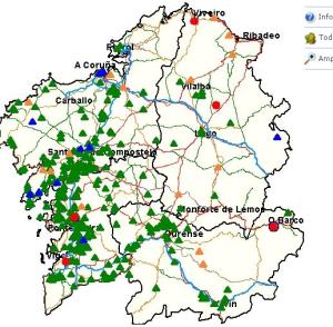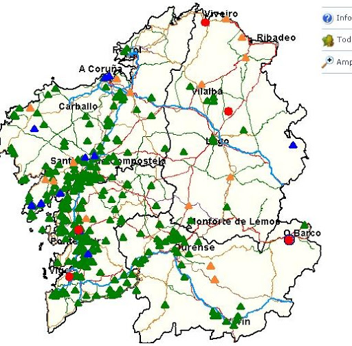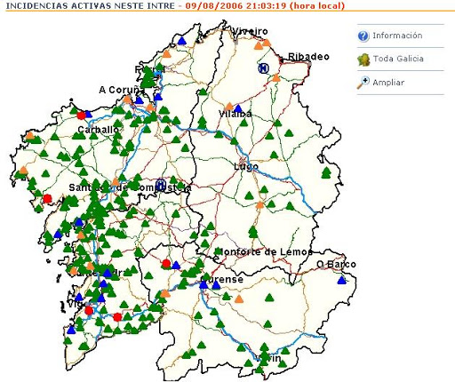 Situación de los focos de incendios entre los días 9 y 11 de Agosto de 2006. Cada pirámide verde, representaba un foco de fuego. Capturas de la página de 112 Galicia, entre el 9 y 11 de Agosto.Todo ello, a pesar de que era una publicidad muy negativa para el gobierno, que en muchas ocasiones estaba desbordado por la magnitud de la catástrofe. De hecho, la mayoría de medios de comunicación podían tener directa con el Conselleiro de Medio Rural, Alfredo Suárez Canal, pudiéndolo localizar a la 1 de la mañana para entrar en directo en los medios informativos, algo que fue aplaudido incluso por la oposición.