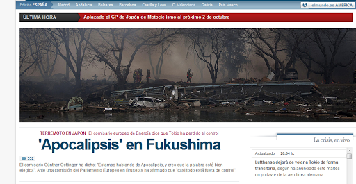 El diario El Mundo, un experto en jugar con las fotografías de las portadas, nos vuelve a demostrar su arte en su portada de la edición digital de esta tarde/noche. Aprovechando las declaraciones de Günther Oettinger, en las que habla de Apocalipsis para referirse a Fukushima, El Mundo lo muestra con una fotografía de un incendio ocurrido tras el tsunami. Descontextualización en su estado puro.