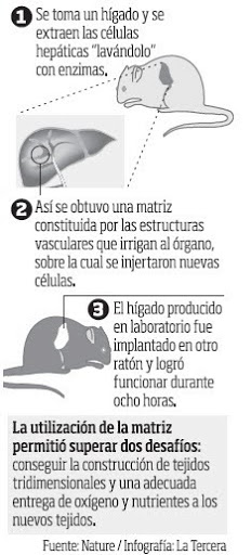 Para sortear esta barrera los investigadores tomaron el hígado de un ratón de laboratorio y lo limpiaron, es decir, extrajeron todas las células hepáticas y dejaron sólo una estructura translúcida, compuesta por fibras de colágeno y vasos sanguíneos.