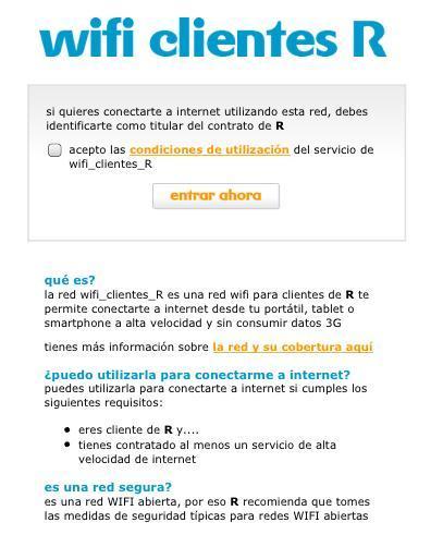El acceso a la red se permite para los clientes de R que tengan contratado al menos un servicio de alta velocidad de internet y se hace mediante la conexión a la red wifi_clientes_R de forma que accederán a una pantalla de validación que le pedirá sus datos como cliente de R, los mismos que se ponen a la hora de acceder a la web de clientes de la compañía