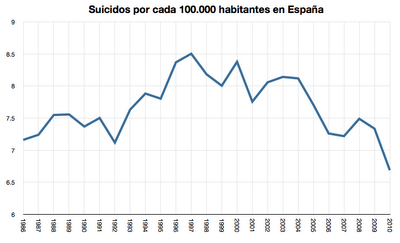 Otros años de la crisis, los suicidios fueron más o menos los mismos que en 2010 (3.429 en 2009; 3.421 en 2008; 3.263 en 2007…). En 2005, cuando la economía era aún boyante, se quitaron las vida 3.381 personas. En 2000, 3.393. Habría que remontarse hasta 1993 para encontrar una cifra más baja: 3.037. Esto indica que la crisis no ha hecho que aumente este tipo de muertes y que, ante las adversidades, los españoles no nos dejamos vencer.