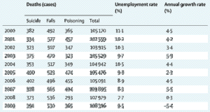 En la tabla se muestra el número de muertes por suicidio, accidentes y envenamientos accidentales en Grecia entre los años 2000 y 2009, así como las tasas de desempleo y el índice de crecimiento. Fuente y elaboración Health and the financial crisis in Greece