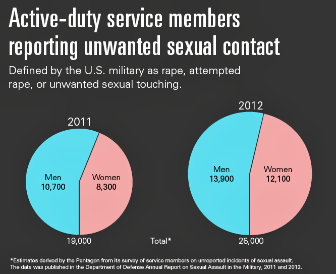 El informe anual del Pentágono (pdf) muestra un incremento de más de 5.000 personas con relación a la misma encuesta de 2011 y a pesar de que el número de mujeres y de hombres atacados es prácticamente igual en número absolutos, las mujeres sufren una mayor proporción de estos ataques al estar en bajo número en el ejército, unas 200.000 en comparación con 1,2 millones de hombres. Según un informe del Pentágono difundido por la CBS, una de cada tres mujeres soldado ha padecido abusos, frente a 1 de cada 6 civiles que ha afrontado semejante situación. Sin embargo, las cifras de estos ataques contra los hombres, siguen pasados por alto prácticamente omitidos y en cualquier caso, muy pocos casos se denuncian, ya que en 2012, tan solo se denunciaron 3.374 casos, una cifra prácticamente igual a la de 2011, 3192.