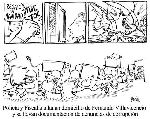 La viñeta hace alusión a una intervención policial con registro realizado en la casa de Fernando Villavicencio el 27 de diciembre de 2013, donde la fiscalía buscaba documentos por supuesto espionaje a altos funcionarios del Gobierno (A mediados de 2013 Jiménez y Villavicencio fueron demandados por el presidente Rafael Correa por haber afirmado que cometió un delito de lesa humanidad en la sublevación policial del 30 de septiembre del 2010). Correa ha justificado recientemente el allanamiento.