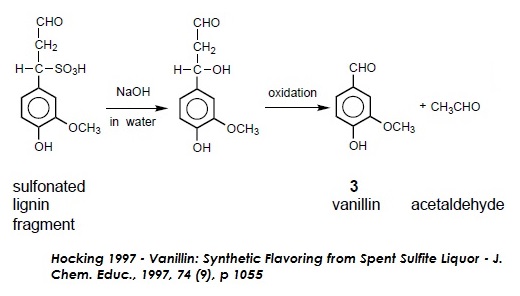 – Hocking 1997 – Vanillin: Synthetic Flavoring from Spent Sulfite Liquor – J. Chem. Educ., 1997, 74 (9), p 1055-1059 DOI: 10.1021/ed074p1055