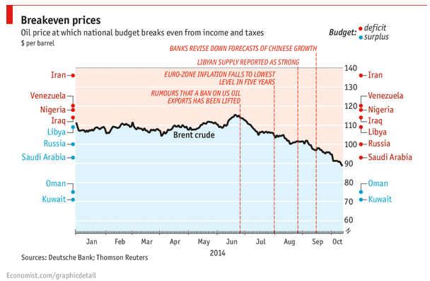 Gráfico de The Economist – Precio necesario del barril de petróleo para que cada país cuadre sus presupeuestos.