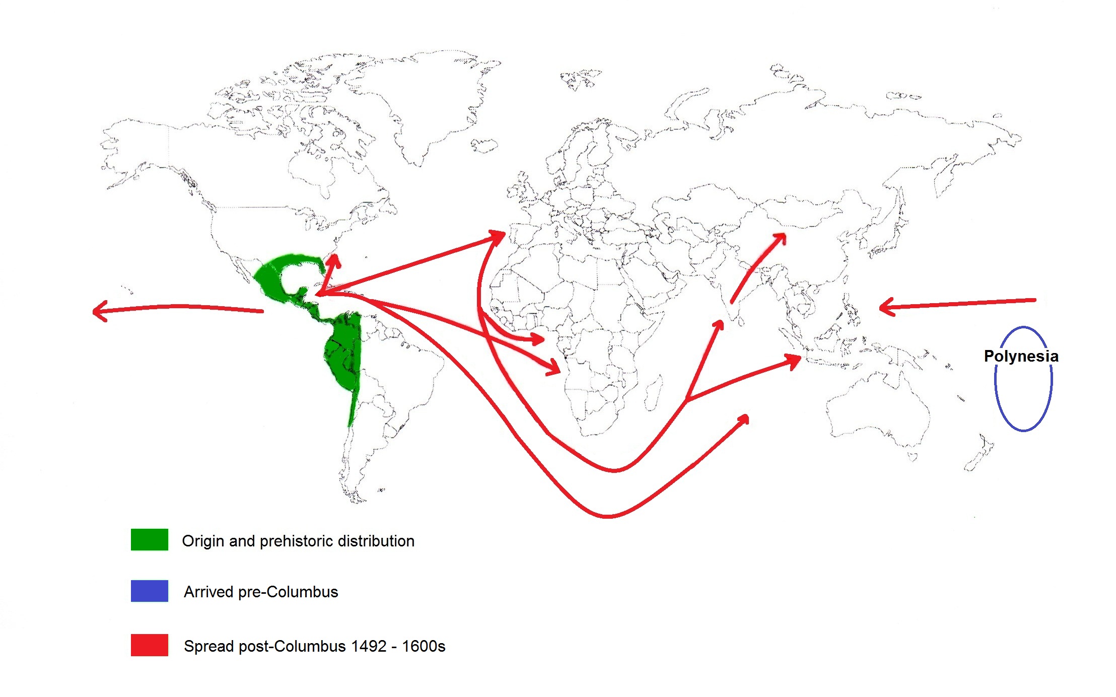 Mapa con el origen y distribución de Ipomoea batatas – Imagen de Irene Lucas (Universidad de Reading)
